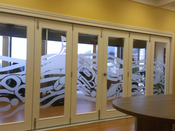 Engraved Glass Panels | Vancouver Engraved glass panels offer an excellent way to create separations in workspace while keeping the overall space light and airy. For the Native Housing Society, the glass is used to separate rooms and individual workstations