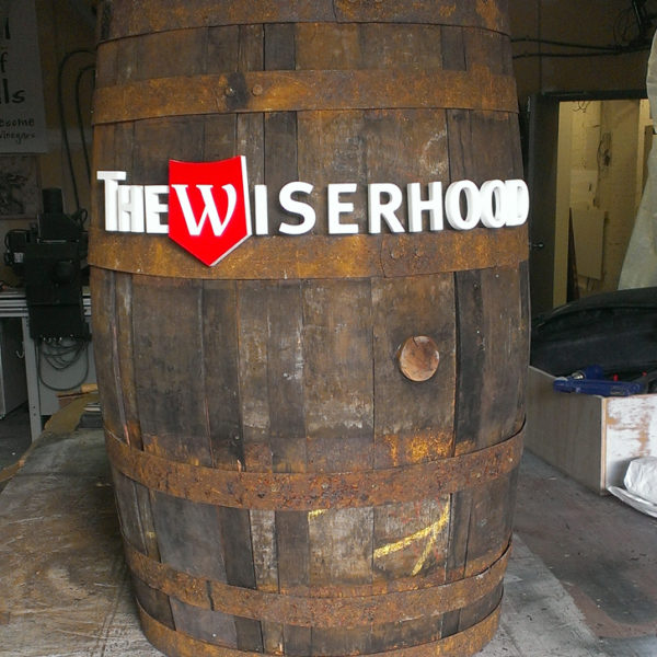 Surface Mount CNC Cut Lettering | Vancouver, Downtown. To create a unique entrance experience that pays homage to the reason for pubs The Wiserhood text logo has been CNC cut from ultra-board and mounted to semi rigid surface mounts